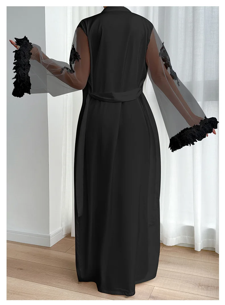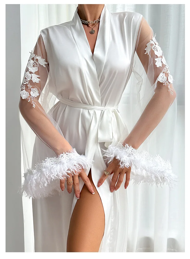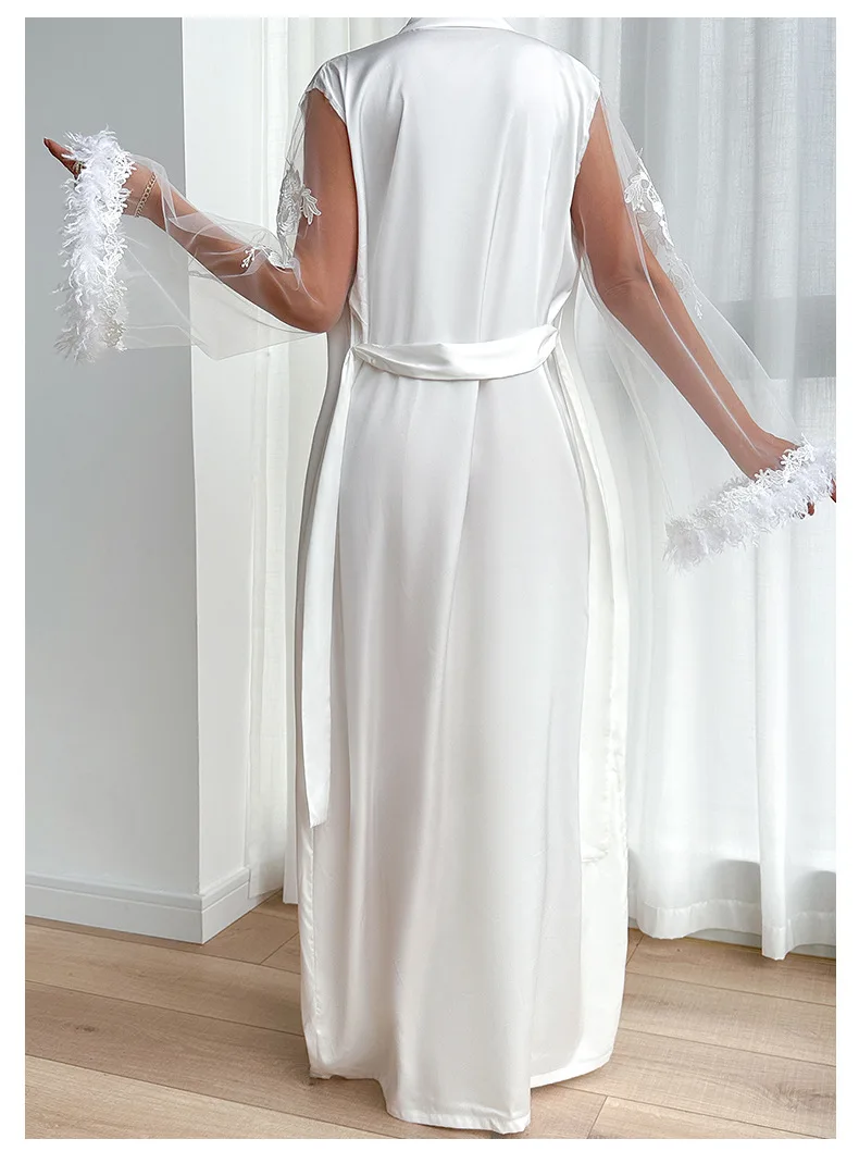 Strona Główna » Produkty » Bielizna Nocna » Peniuary » Długi peniuar z haftowanymi rękawami i piórami