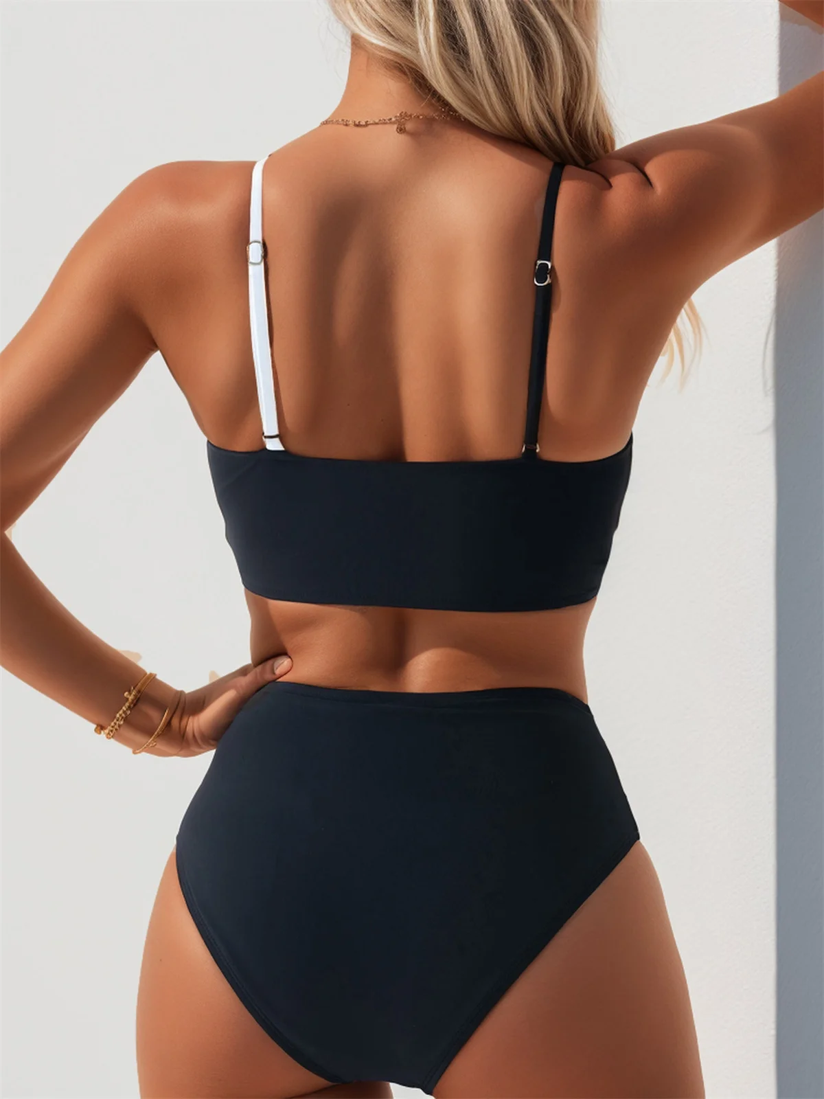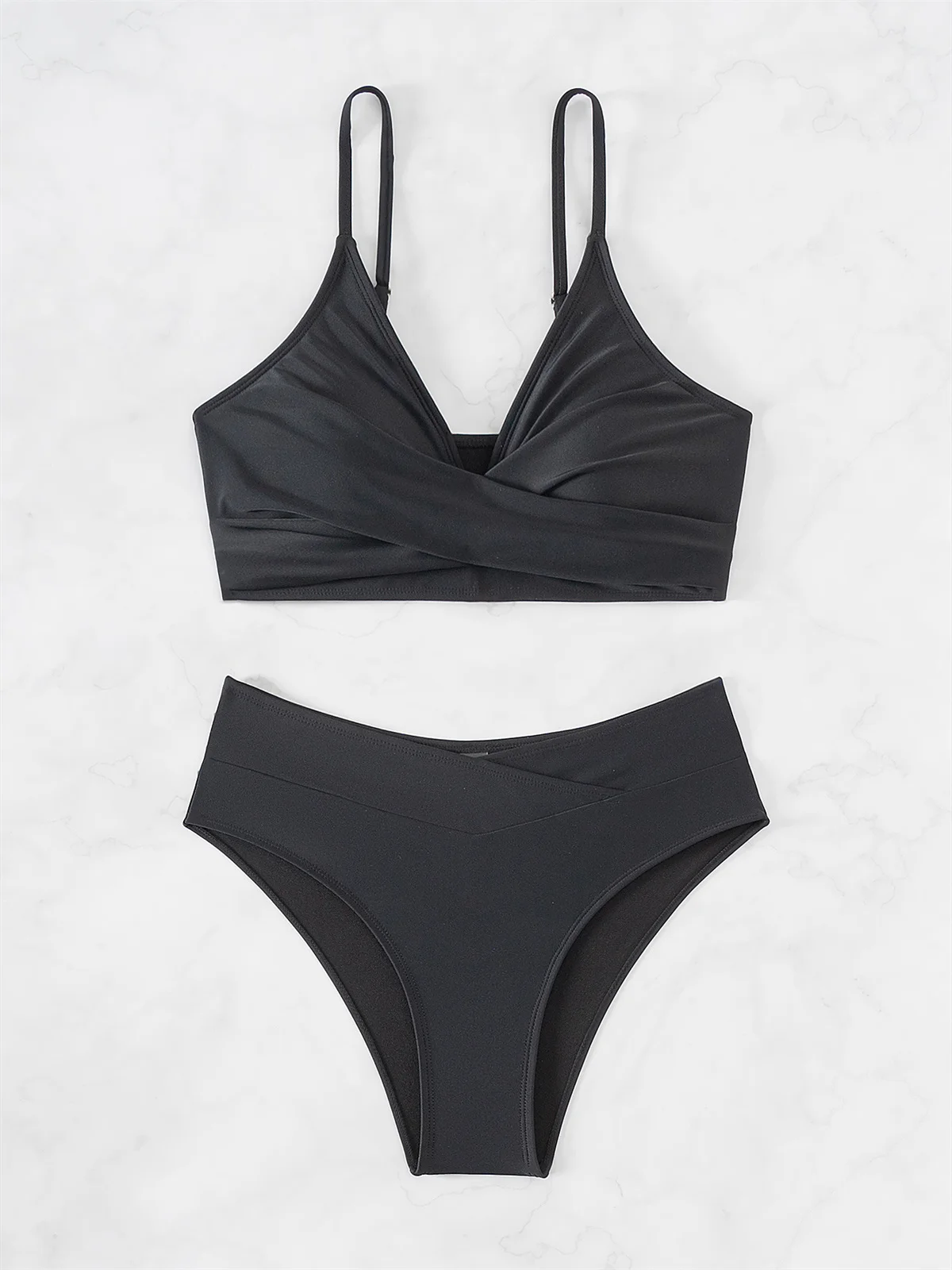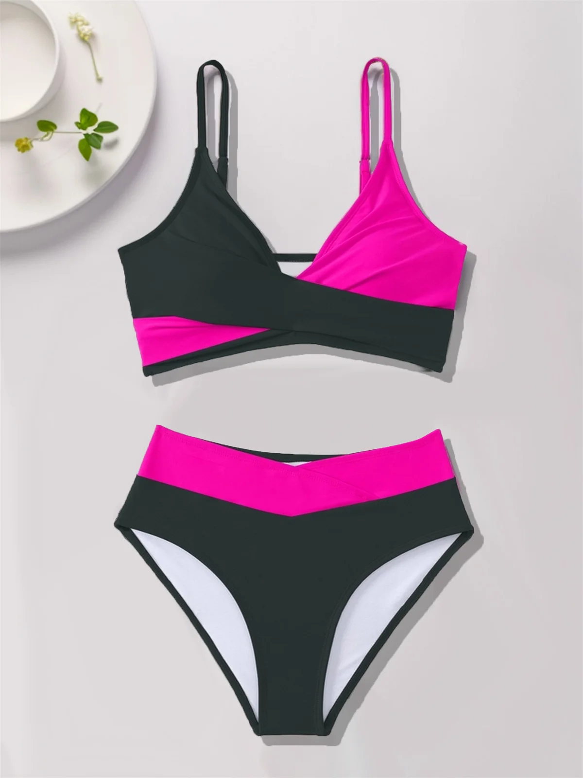 Dwuczęściowy strój kąpielowy z kopertową górą i kontrastowym pasem