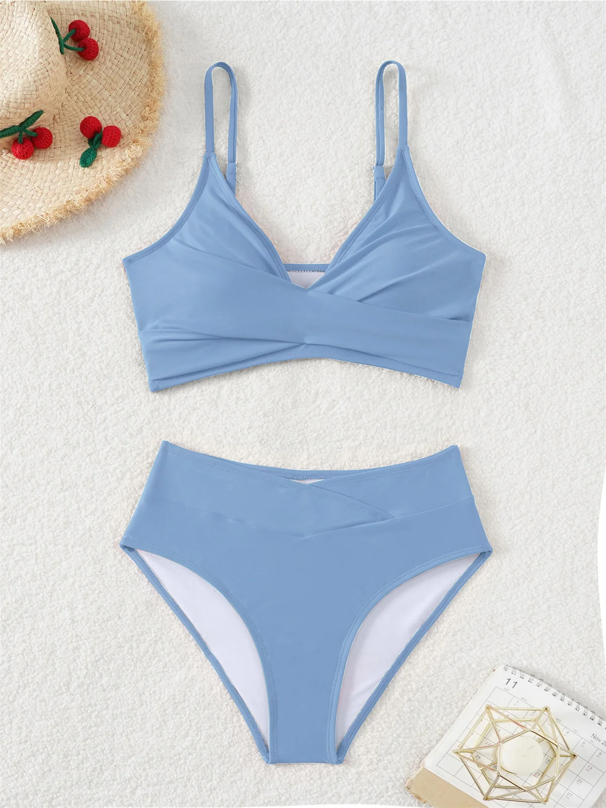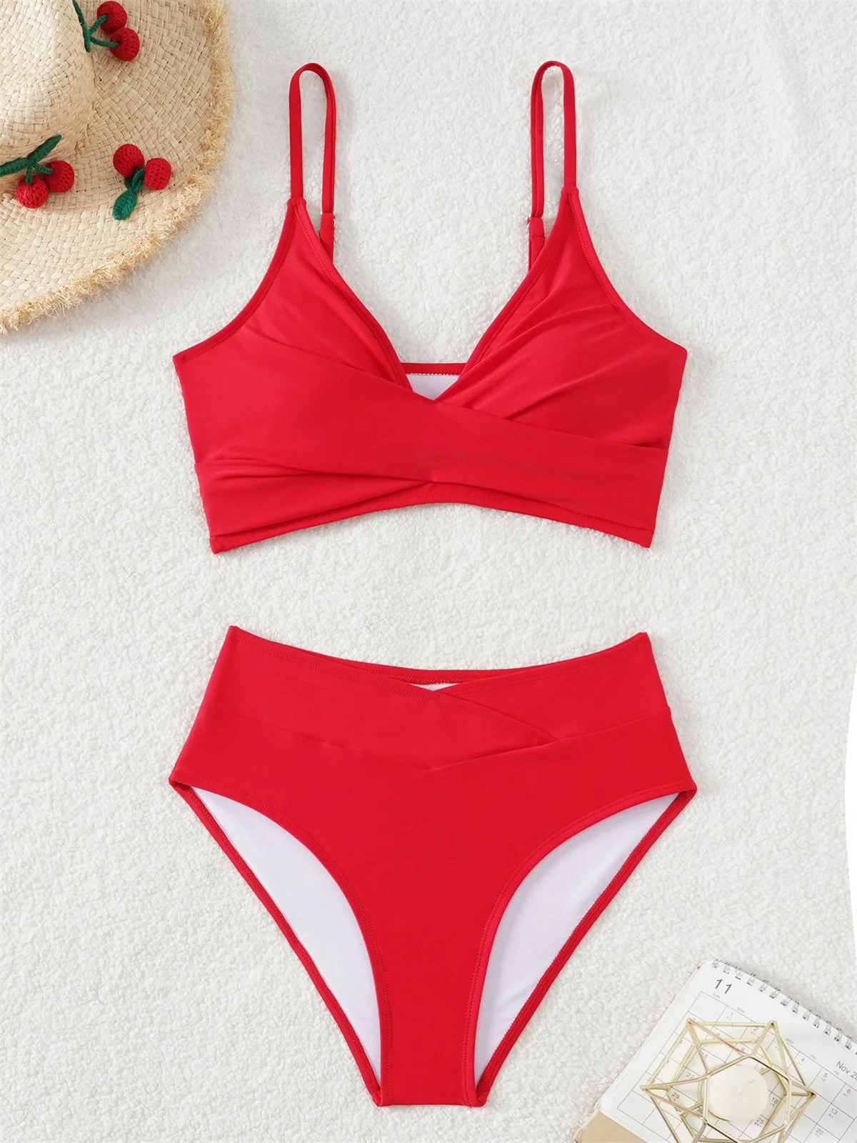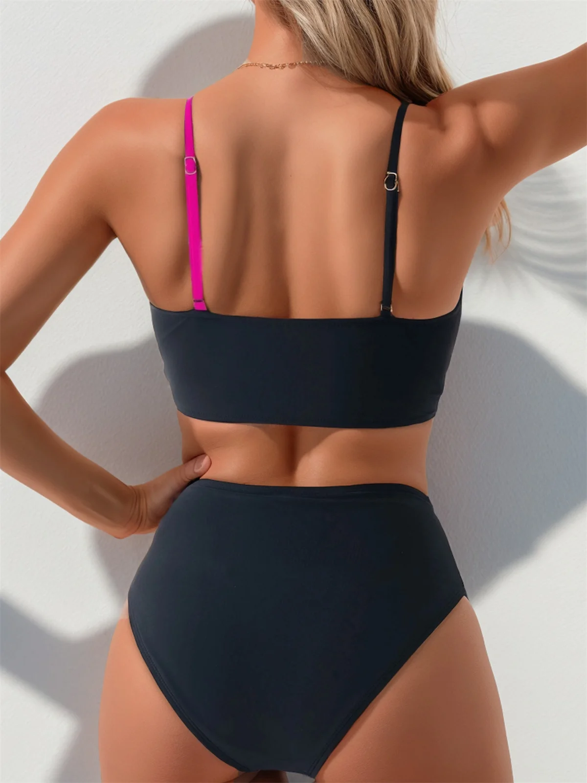 Dwuczęściowy strój kąpielowy z kopertową górą i kontrastowym pasem