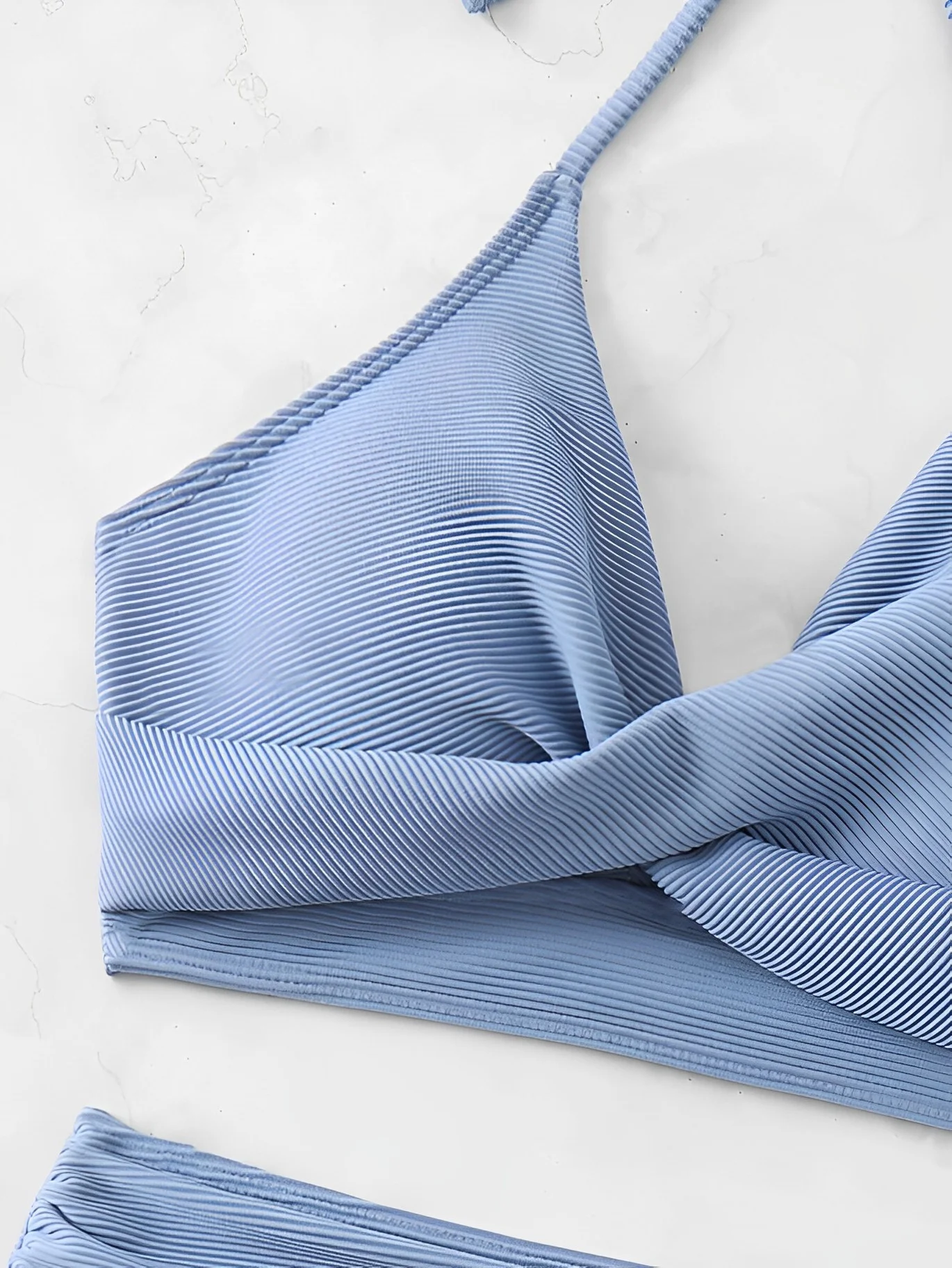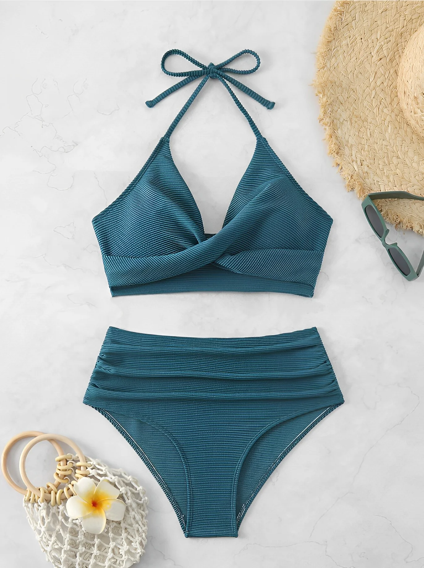 Dwuczęściowy kostium kąpielowy z kopertową górą i wysokim stanem