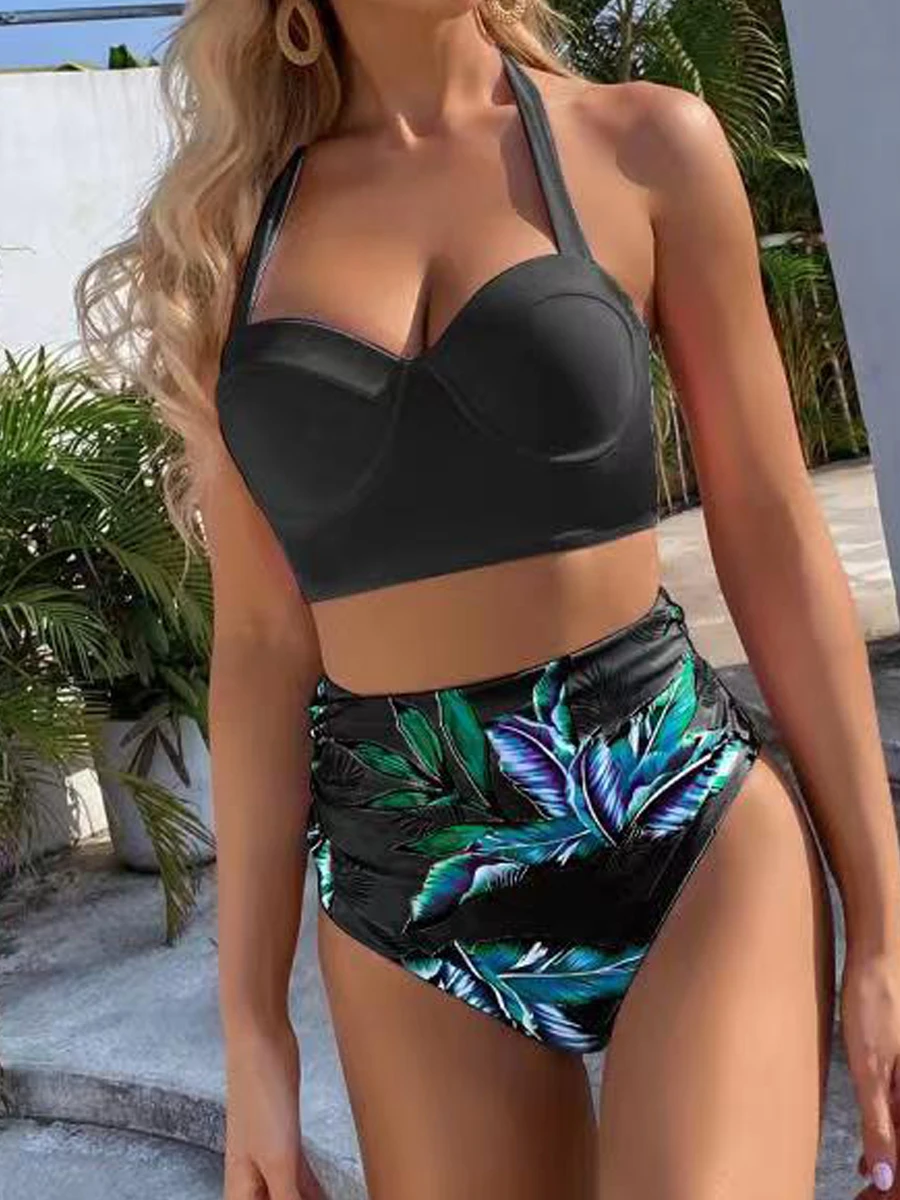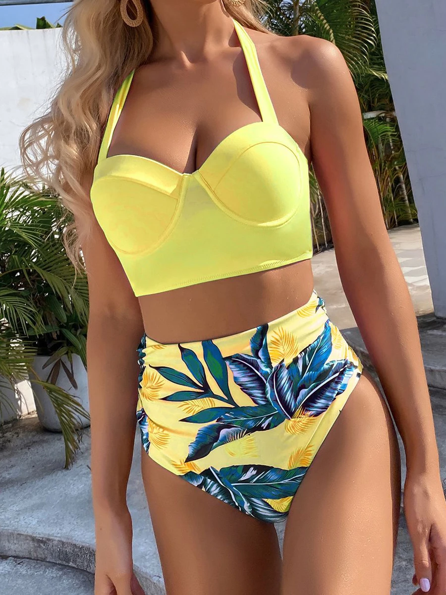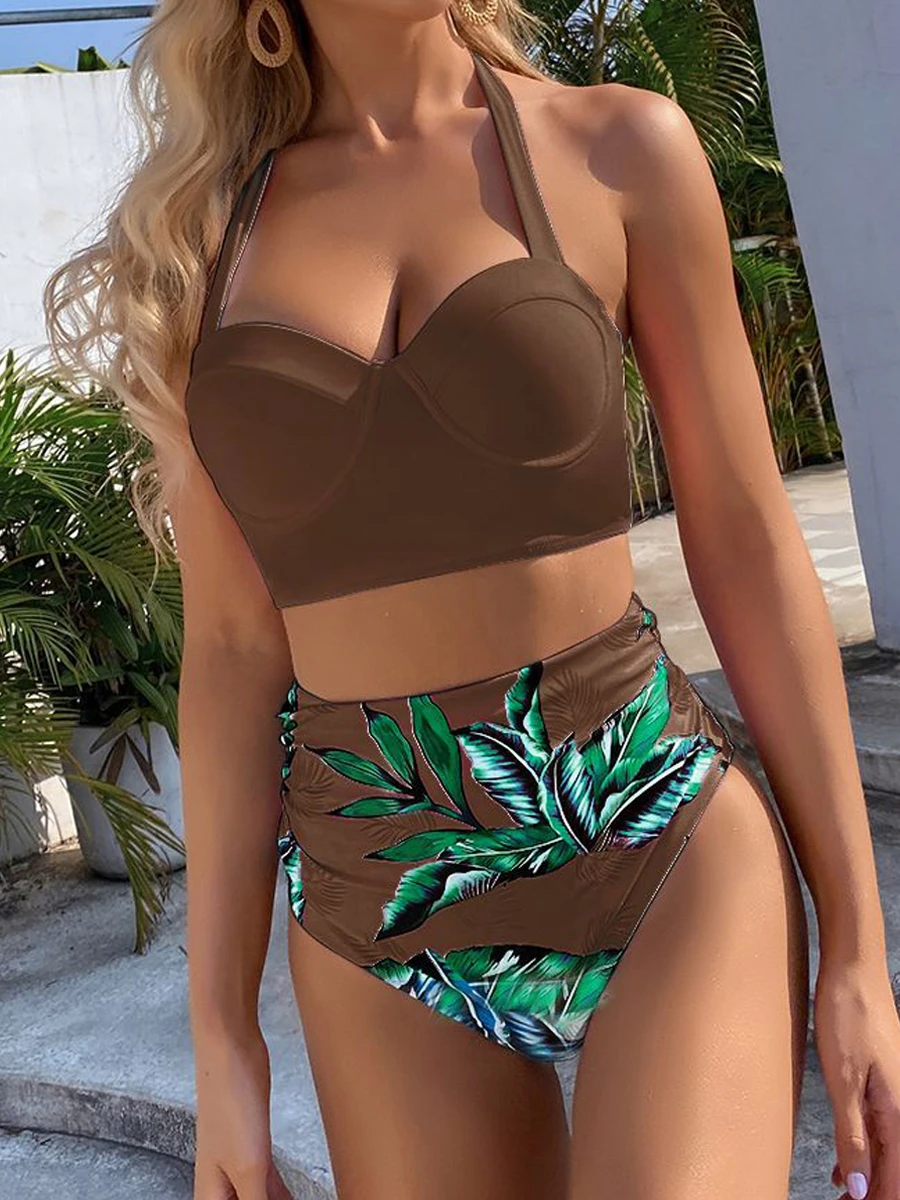 Dwuczęściowy strój kąpielowy z wiązaną górą i tropikalnym wzorem