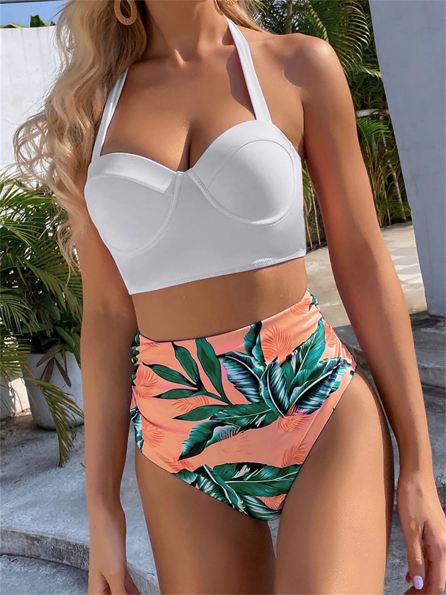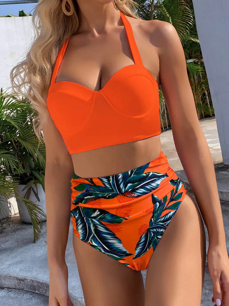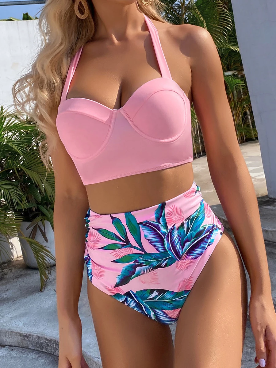 Dwuczęściowy strój kąpielowy z wiązaną górą i tropikalnym wzorem