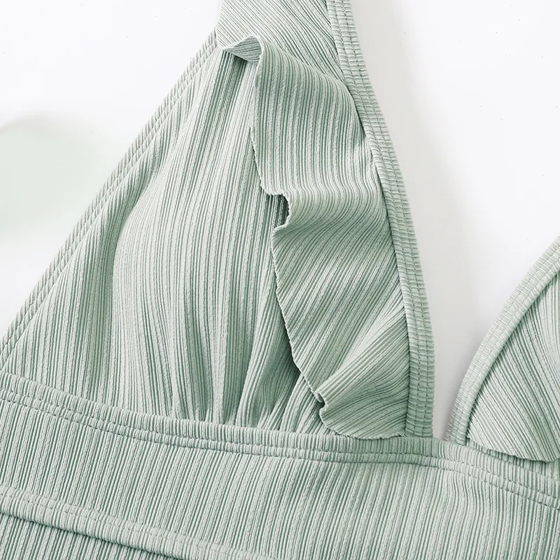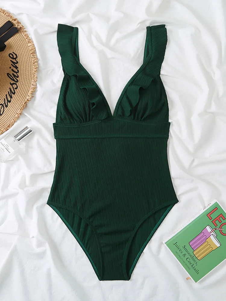 Jednoczęściowy kostium kąpielowy z falbanami na ramionach i związaniem na plecach