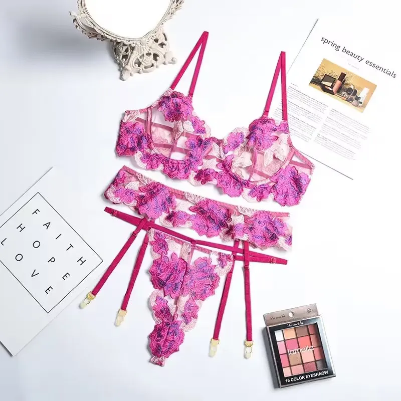 1 opinia dla Zestaw bielizny z kwiatowym haftem w kolorze fuksji i pasem do pończoch