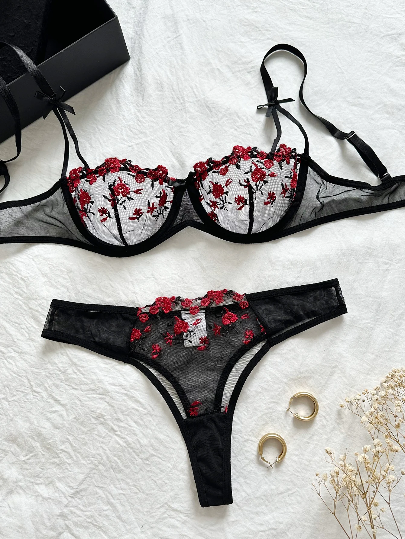 14 opinii dla Zestaw bielizny z haftowanymi kwiatami i przejrzystym tiulem