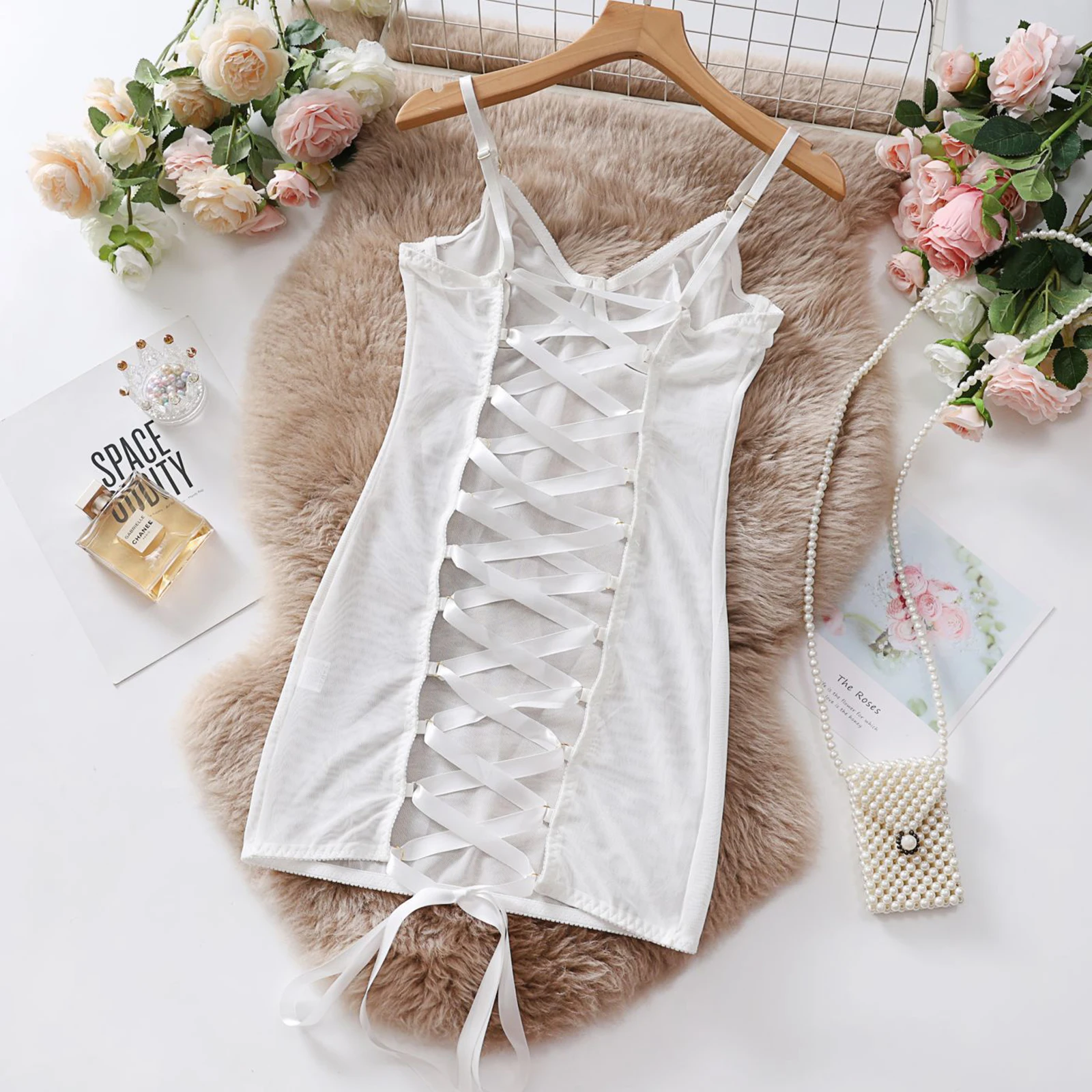 Strona Główna » Produkty » Bielizna Nocna » Koszule Nocne » Koszule nocne na ramiączkach » Mini sukienka z siateczki z krzyżowym sznurowaniem i otwartym tyłem