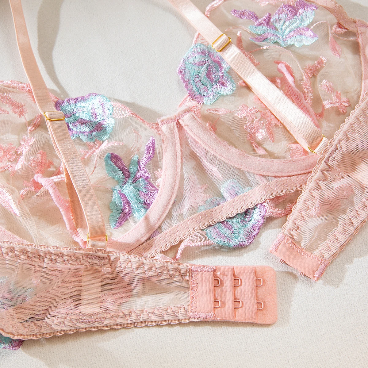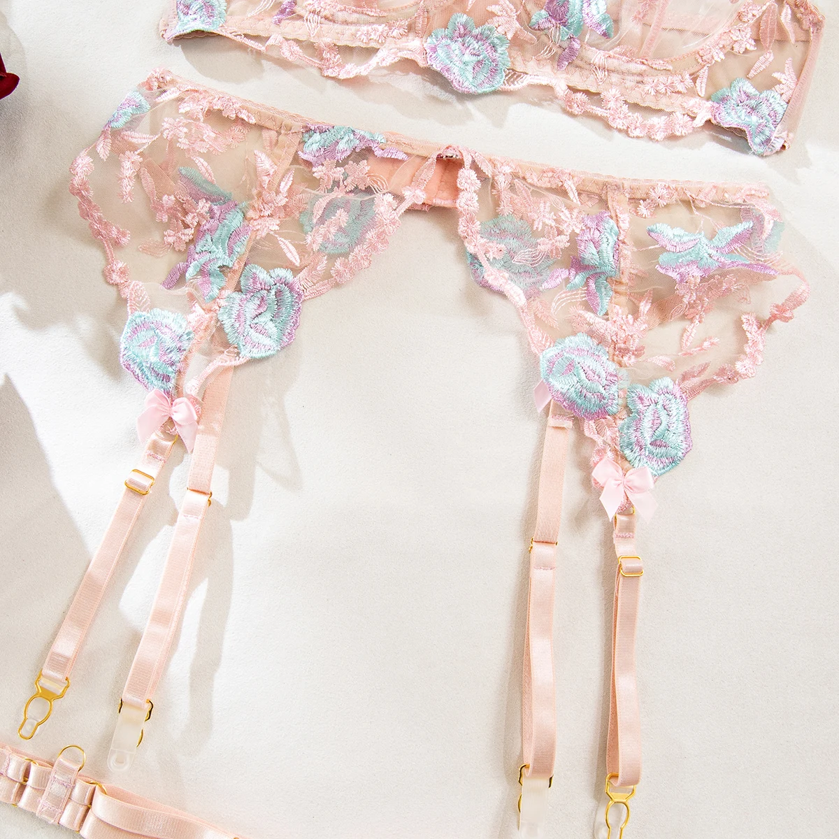 1 opinia dla Różowy zestaw z kwiatowym haftem i pasem do pończoch