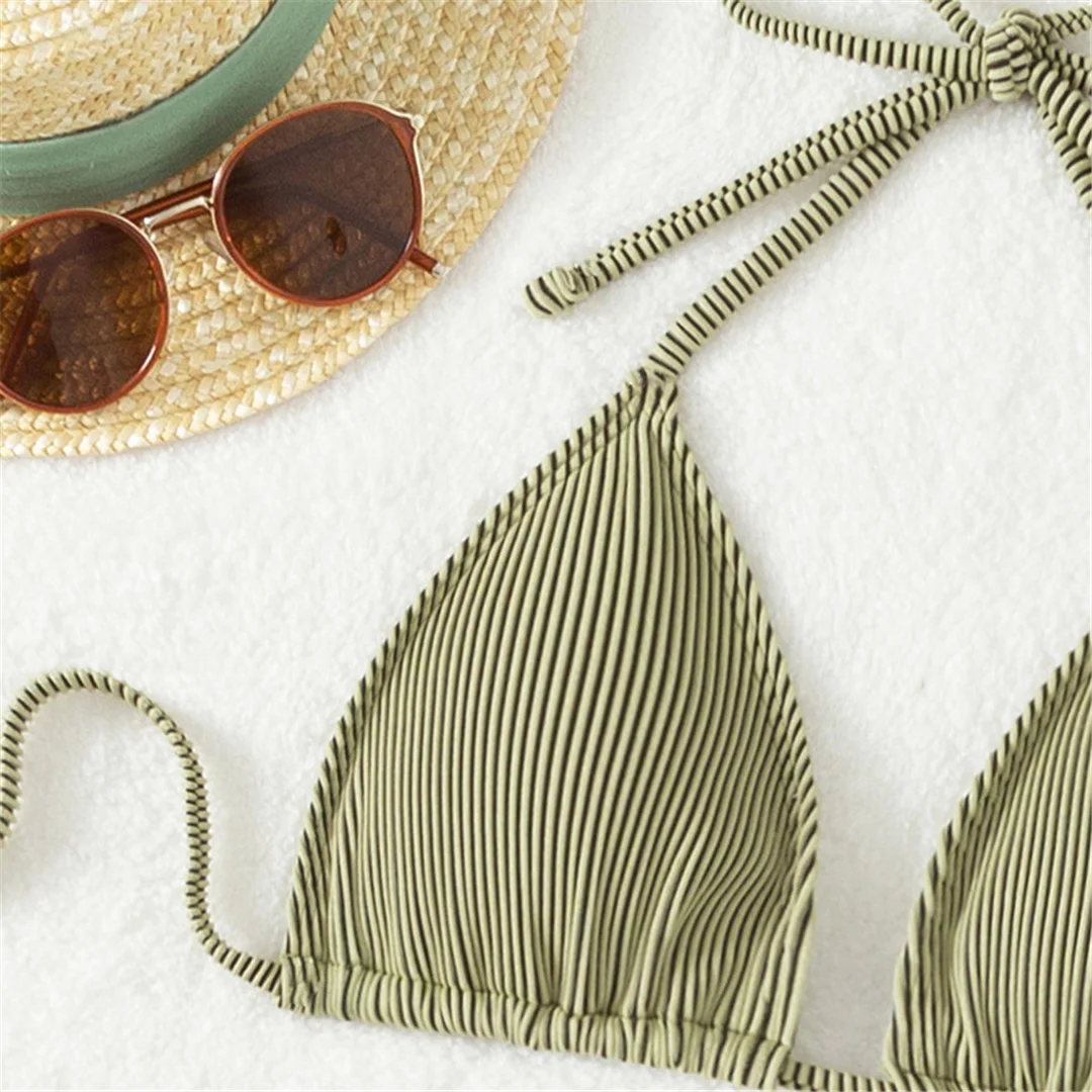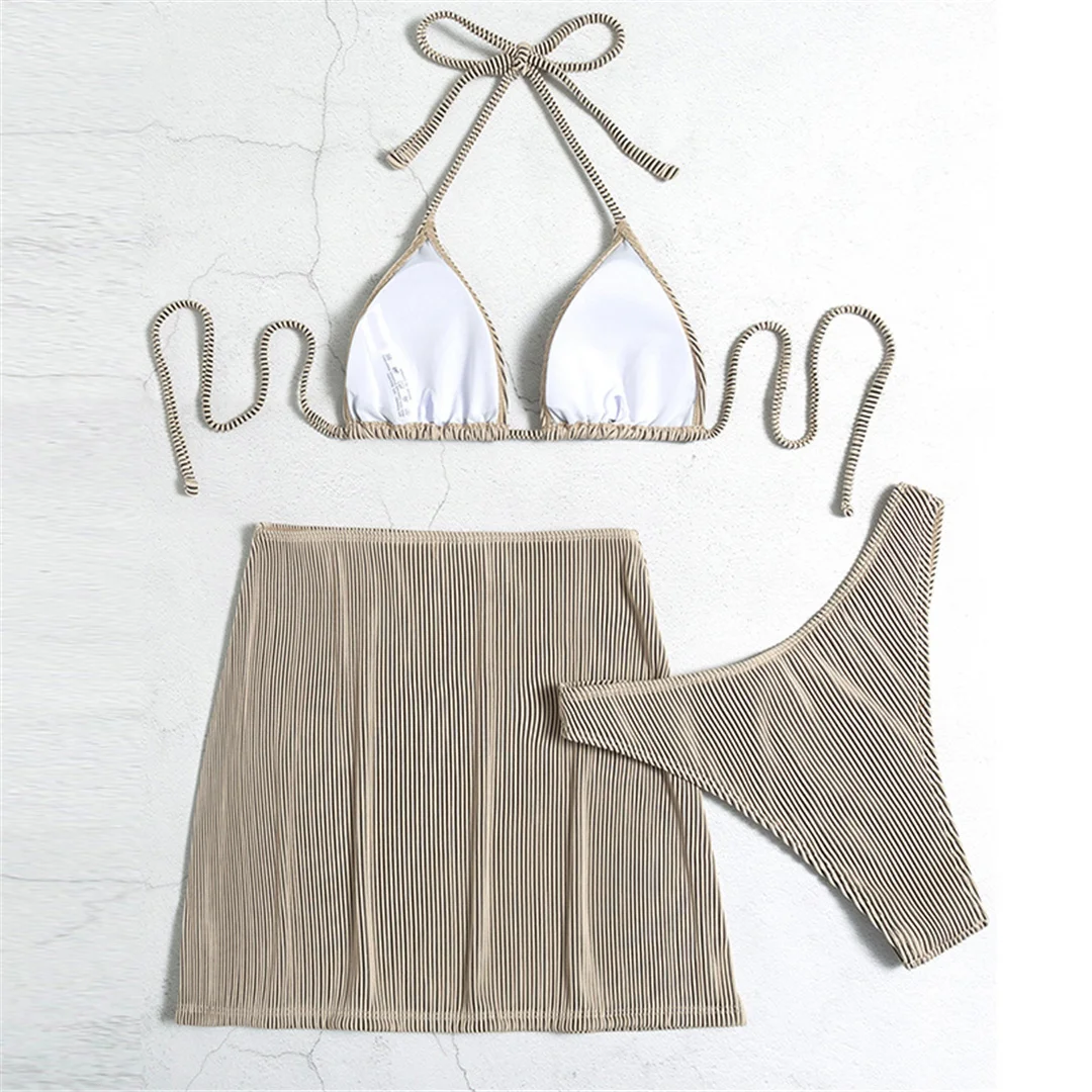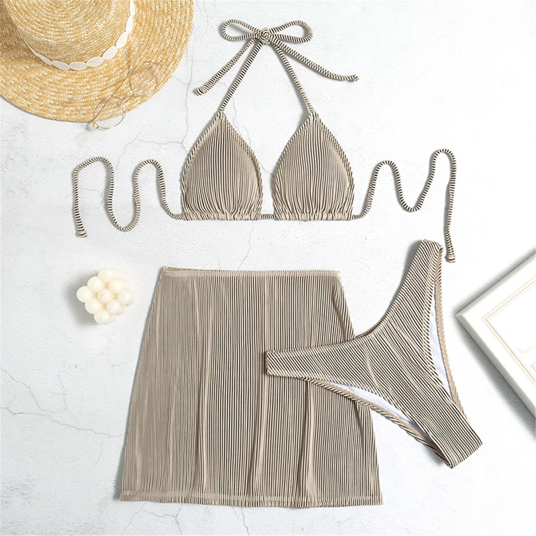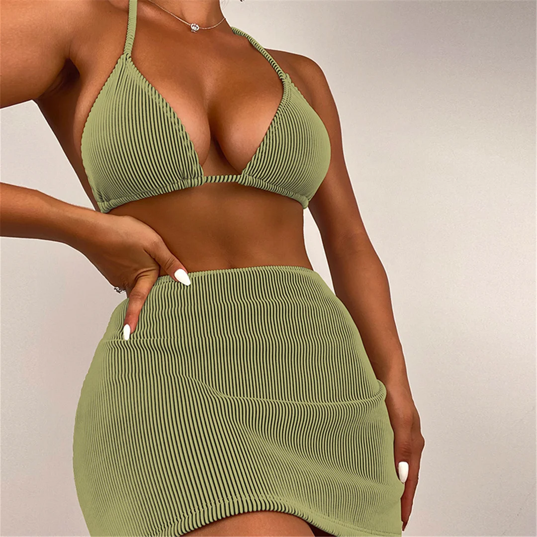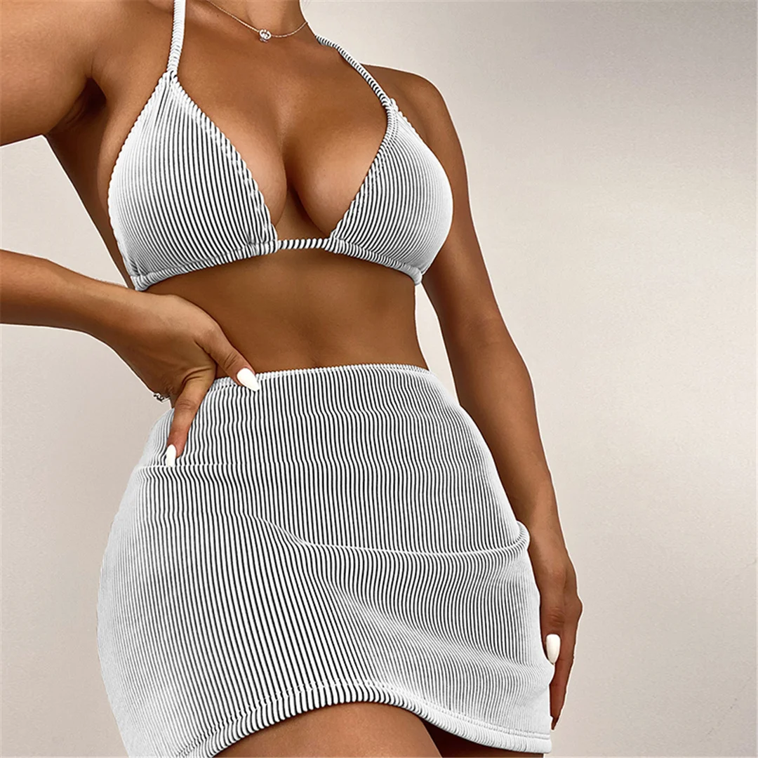 Trzyczęściowy kostium kąpielowy z prążkowaną tkaniną i mini spódnicą